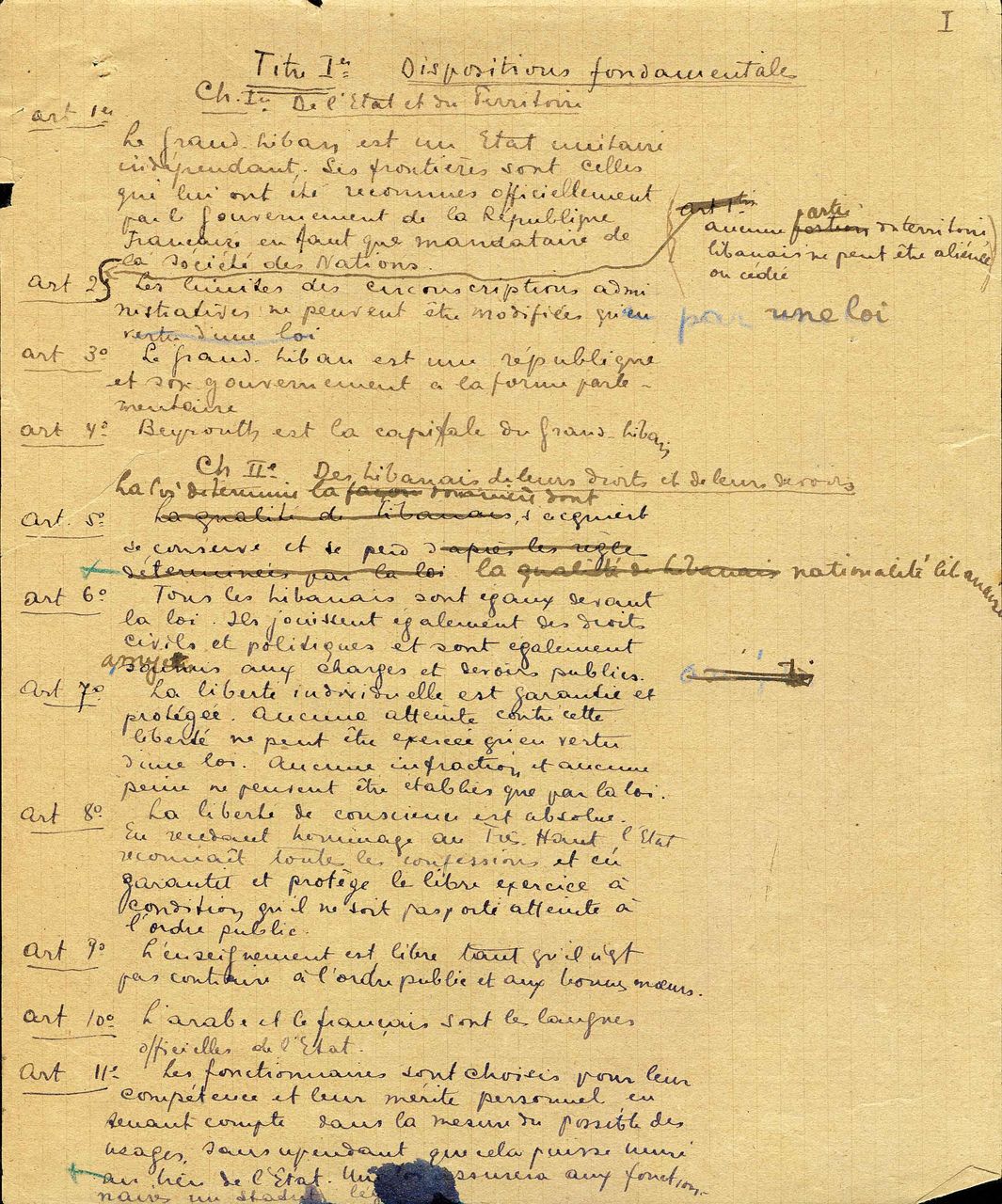 DOC-01 - Titre 1er Dispositions fondamentales (manuscript, in Michel Chiha ['MC']'s handwriting) 85 arts., 15pp.